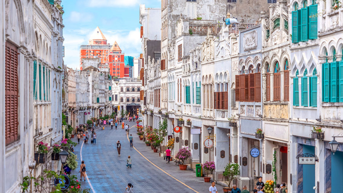 Qilou Old Street features a stylish fusion of European and Asian architecture, with Indian and Arabic influences. Standing between two and four stories high, a Qilou has its ground floor set back halfway into the building so that it can be used as a storefront which is sheltered from both rain and sun. The upper floors serve as the living quarters, and extend over the pavement supported by columns. The exquisite carvings and decorations on the handrails, door frames and window frames are in the Baroque style.