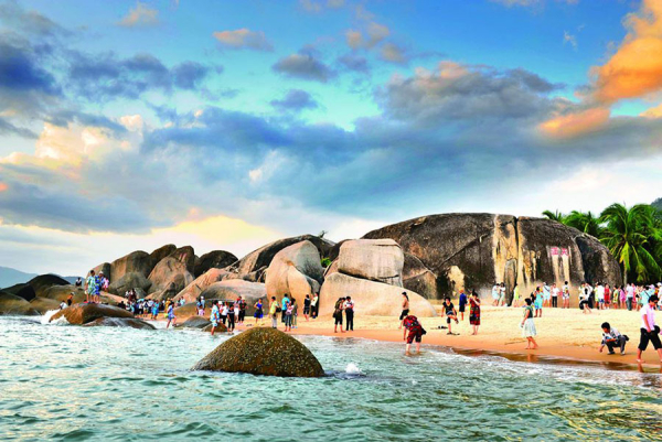 Here, the bluish green ocean blends into the sky as if they were one. Misty waves, spots of sails, swinging coconut trees and exotic stones all come together to form a picturesque landscape. Giant rocks inscribed with "End of the Skies", "Corner of the Sea" and "Giant Pillar in the South China Sea" standing on the shore are a part of the rare scenery of Hainan.