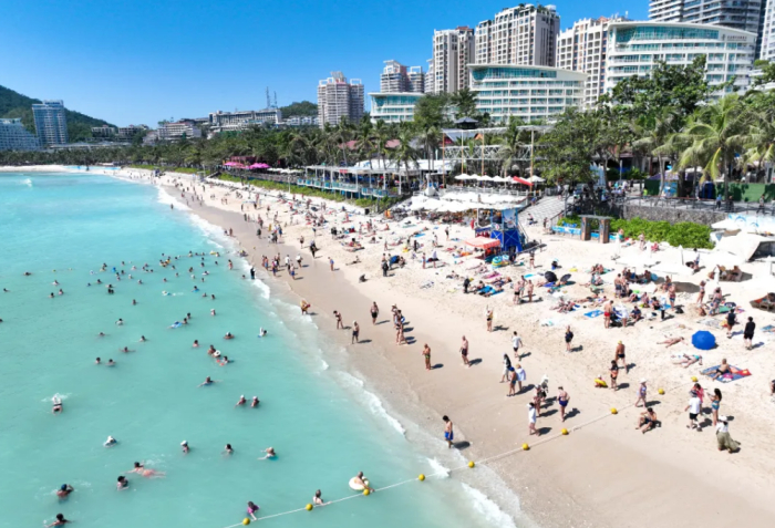 Domestic and international vacationers enjoy their leisure time on the beach at Dadonghai Bay, Sanya.