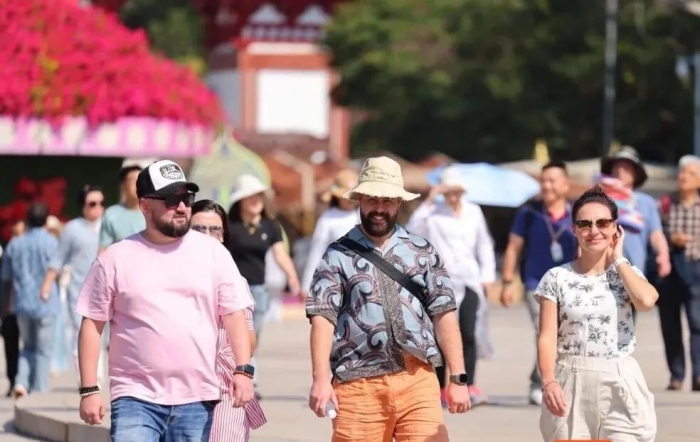 Foreign tourists visit the Nanshan Cultural Tourism Zone in Sanya during the New Year holiday period.