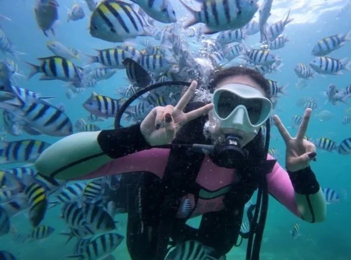 Hainan International Tourism Promotion Ambassadors try out diving at Wuzhizhou Island in Sanya.