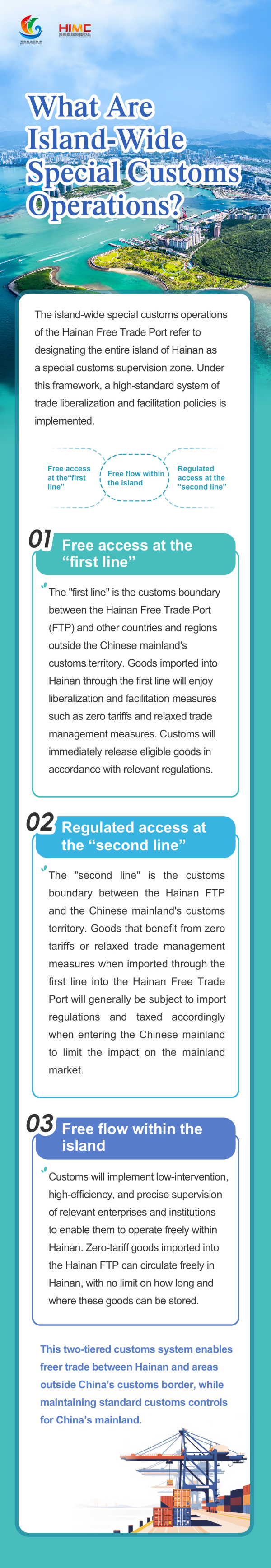 The launch of island-wide special customs operations marks a new phase in the opening-up and development of Hainan FTP and the start of a long-term project that requires steady and continuous efforts. The following series of posters provide a breakdown of the information, highlighting the key aspects and policies of special customs operations at this stage, as well as policy adjustments, measures to further expand opening-up, and the future development outlook.