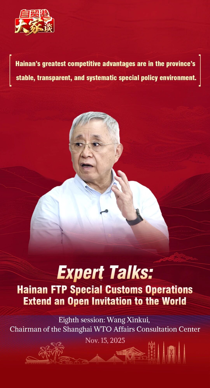 The island-wide special customs operations of the Hainan Free Trade Port (FTP) are set to officially commence on December 18, 2025. Following their implementation, how will the Hainan FTP further boost its traction? In the 8th episode of Expert Talks on the Hainan FTP, we sit down with Wang Xinkui, Chairman of the Shanghai WTO Affairs Consultation Center, to get his perspective.